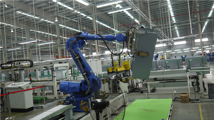 3、壓縮機自動化組裝。冰箱發(fā)泡后豎身45度、由機械手固定安裝壓縮機的工裝設(shè)備,目前已投入實際應(yīng)用。機器人識別、搬取、固定壓縮機的裝備技術(shù),改變了原先操作工身兼搬運工、甚至焊接工的情況,明顯降低了現(xiàn)場工人的勞動強度,成為冰箱生產(chǎn)自動化的重要環(huán)節(jié)之一。