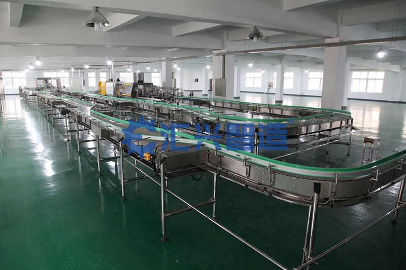 鏈板輸送線以標(biāo)準(zhǔn)鏈板為承載面,由馬達(dá)減速機(jī)為動力傳動;我們可以通過多列鏈板并行,使鏈板輸送線做的很寬并形成差速,利用多列鏈板的速度差使多列輸送在無擠壓的情況下變?yōu)閱瘟休斔?,從而滿足飲料貼標(biāo)、灌裝、清洗等設(shè)備的單列輸送的要求,同樣也可以使單列變成多列并行走緩慢,從而產(chǎn)生儲存量,滿足殺菌機(jī)、儲瓶臺、冷瓶機(jī)的大量供料的要求,我們可以將兩條鏈板輸送線的頭尾部做成重疊式的混合鏈?zhǔn)沟闷浚ü蓿w處于動態(tài)過度狀態(tài),使輸送線上不滯留物料,可以滿足空瓶以及實瓶壓力和無壓力輸送。
