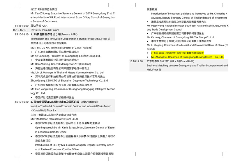 交流會上進行粵港澳大灣區(qū)與泰國合作發(fā)展研討暨廣東省企業(yè)未來發(fā)展計劃介紹,廣東省商務廳副廳長陳越華先生作主持。廣東省發(fā)展與改革委員會主任、推進粵港澳大灣區(qū)建設領導小組辦公室主任葛長偉先生帶來《共享粵港澳大灣區(qū)發(fā)展新機遇、推動廣東與泰國合作發(fā)展》的主題分享,珠海格力電器股份有限公司董事長董明珠女士、科大訊飛科大訊飛股份有限公司高級副總裁杜蘭女士介紹企業(yè)未來在泰國合作發(fā)展及投資計劃。交流會還進行《粵港澳大灣區(qū)建設背景下粵港與泰國合作發(fā)展機遇》研討沙龍環(huán)節(jié),與泰國政商界代表共同探討促進廣東和泰國雙方的交流與合作。
