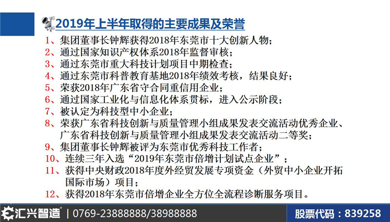 大會(huì)第五項(xiàng)議程知識(shí)產(chǎn)權(quán)部經(jīng)理蔣明華“年上半年取得的主要成果匯報(bào)”。實(shí)力見(jiàn)證榮耀,品質(zhì)鑄就輝煌。公司始終牢記“做受尊敬的好人、造受尊敬的產(chǎn)品、辦受尊敬的企業(yè)、建受尊敬的平臺(tái)”的企業(yè)使命,砥礪奮進(jìn),載譽(yù)而歸。這些榮譽(yù)既是對(duì)匯興智造年上半年成就的肯定,又是對(duì)未來(lái)發(fā)展的勉勵(lì)!