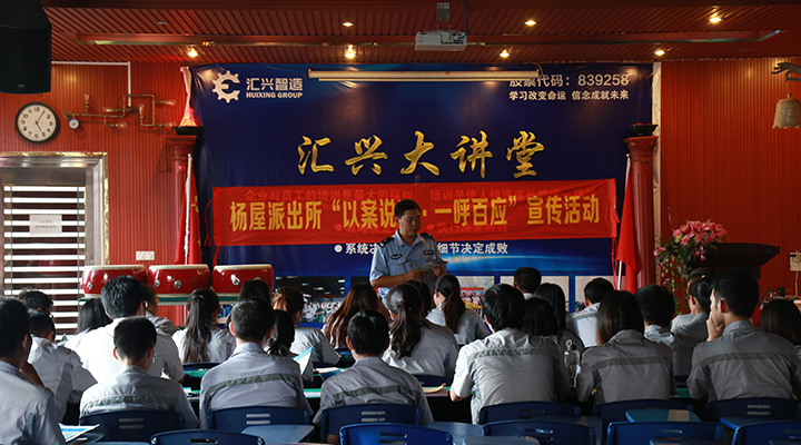 為進一步增強廣東匯興精工智造股份有限公司(股票代碼:839258)全體員工的自我保護意識,提高自我防范能力,預(yù)防和減少詐騙跟盜搶性案件的發(fā)生, 7月29日下午,匯興智造特邀楊屋派出所民警走進企業(yè),為全體員工開展“防騙、防搶”安全知識講座。公司全體辦員工代表共計40人在匯興學(xué)校聆聽精彩的講座。