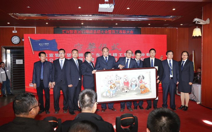 晚會現(xiàn)場,匯興智造董事會、監(jiān)事會成員登臺舉行宣誓儀式,為2018沖鋒表決心、擂戰(zhàn)鼓,確保公司在2020年前實(shí)現(xiàn)效率倍增、業(yè)績倍增、效益倍增,成功登陸創(chuàng)業(yè)板。儀式結(jié)束后,宣誓成員們圍繞在梁培浩教授贈送的畫作《大吉大利》周圍,借用畫上8只憨態(tài)可掬的小狗送出“旺狗賀歲、歡樂祥瑞”的祝福。8,既代表2018,也代表“發(fā)”,祝福匯興智造在2018大發(fā)展,創(chuàng)新高。