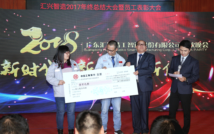 2017年,匯興智造設(shè)立了愛心慈善基金會,為家庭生活異常困難的員工及其家屬奉獻(xiàn)愛心。在晚會現(xiàn)場,家庭遇到極大困難的五名員工接受了愛心捐贈。只要人人都獻(xiàn)出一點(diǎn)愛,世界將變成美好的人間。在場的所有人無不被這一善舉感動拭淚。