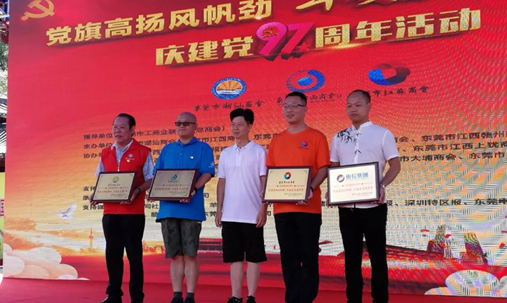 市工商聯(lián)(總商會)副主席張軍民(中間)為活動主辦單位授予榮譽牌匾,東莞市江西商會黨支部書記、匯興智造董事長鐘輝(左二)代表商會上臺