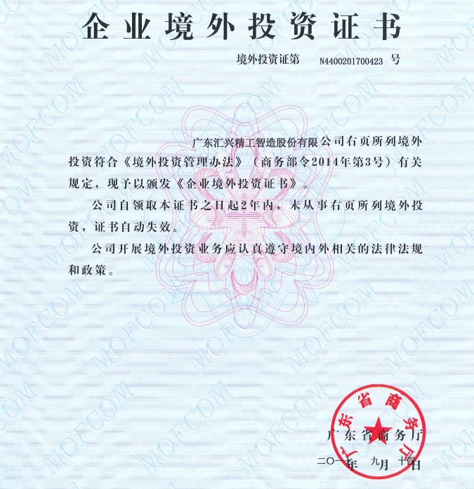2017年8月29日,廣東匯興精工智造股份有限公司(股票代碼:839258)正式獲得企業(yè)對外投資證書。匯興智造赴德設(shè)立全資子公司,是響應(yīng)國家‘一帶一路’這個偉大重要的戰(zhàn)略,從而實現(xiàn)公司可持續(xù)發(fā)展?!耙粠б宦贰睉?zhàn)略的實施,為我們民營企業(yè)“走出去”創(chuàng)造出了難得的歷史機(jī)遇。新的機(jī)遇,既要看天氣,更要接地氣,推動企業(yè)國際化,從來不是紙上談兵,而是爭取如何落到實處。