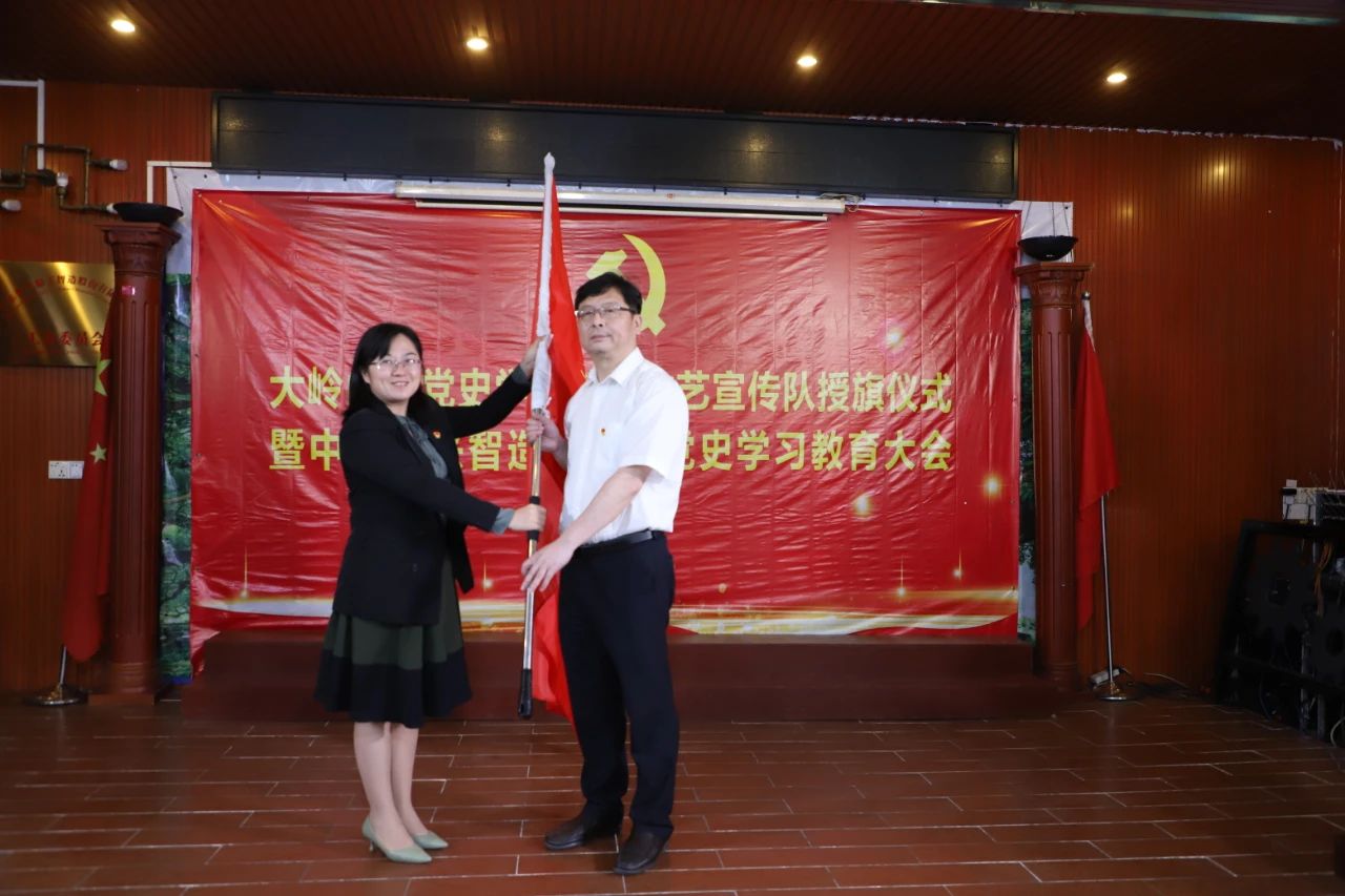 鎮(zhèn)委委員葉淑帆出席并為大嶺山文化服務(wù)中心黨支部書記楊繼春授“黨史學(xué)習(xí)教育文藝宣傳隊”隊旗。鎮(zhèn)宣教文體旅辦、文化服務(wù)中心、黨建工作辦、宣傳文化線代表及匯興智造員工代表約100人參與了活動。