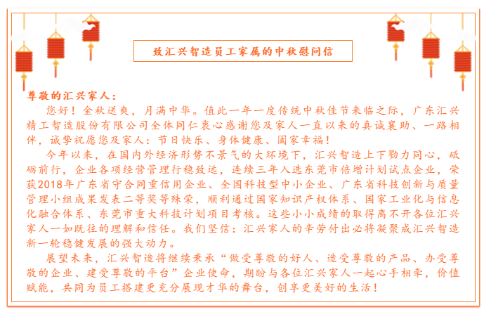 尊敬的匯興家人: 您好!金秋送爽,月滿中華。值此一年一度傳統(tǒng)中秋佳節(jié)來(lái)臨之際,廣東匯興精工智造股份有限公司......
