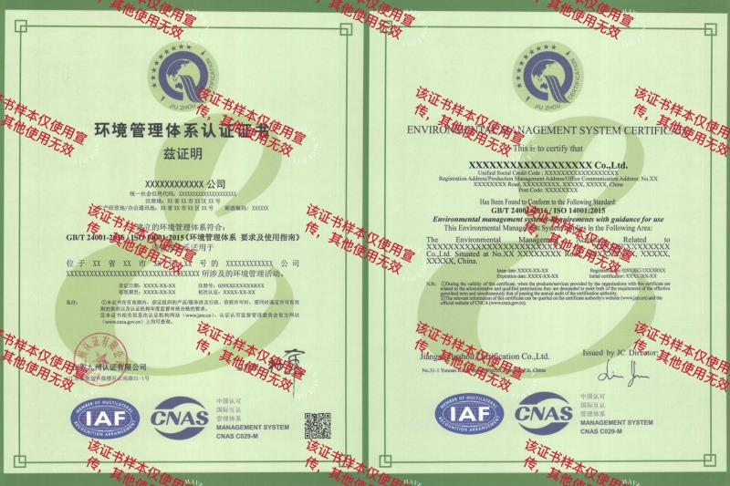 • 環(huán)境管理體系證書樣本