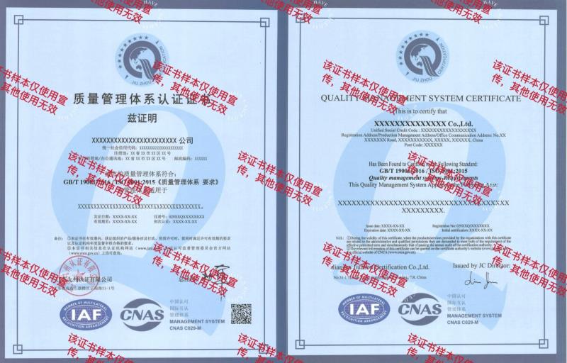 • 質(zhì)量管理體系50430證書樣本